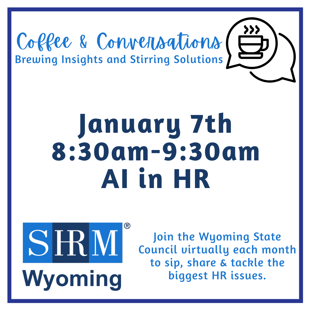 Join the Wyoming State Council virtually each month to sip, share & tackle the biggest HR issues.  These meetings are always held the first Wednesday of the month at 8:30am.